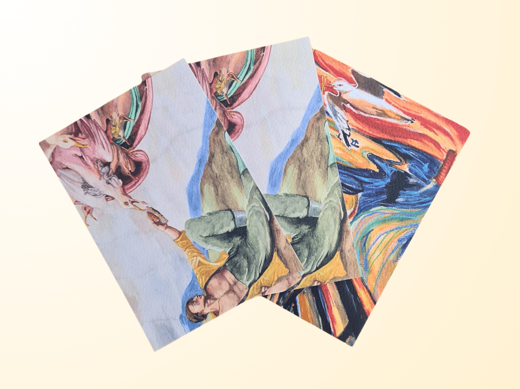 zwei Postkarten Motiv „die Opfergabe“ eine Postkarte „Der Kreisch“ auf hochwertigem Aquarell-Strukturpapier (325 g/m²) mit bedruckter Rückseite.